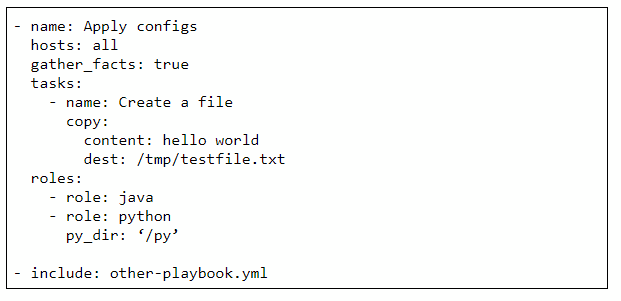 Archivo YAML que contiene una lista de tareas a realizar en un subconjunto de hosts donde además podemos aplicar una serie de roles. Además desde un playbook podemos importar otro playbook por lo que generalmente tendremos un playbook raíz (p.ej: main.yaml) desde el que importamos los otros playbooks.